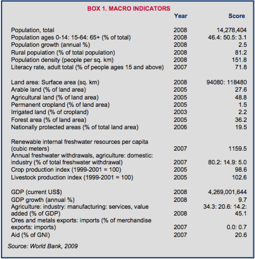 Malawi’s population of 14 million people is 81% rural and 19% urban. Malawi is one of the more densely populated countries in Africa, with an average of 103 inhabitants per square kilometer; population density is highest in the south and central regions. Malawi’s total land area is 94,100 square kilometers, of which 49% is agricultural land. Approximately 2% of Malawi’s cropland is irrigated. Agriculture – especially tobacco, tea, and sugar – currently contributes more than 80% of the country’s export earnings. Malawi’s total gross domestic product for 2008 was US $4.3 billion, derived from agriculture (34%), industry (20%), and services (45%) (World Bank 2009a; World Atlas 2010; Chirwa 2004; Chirwa and Chisinga 2008).