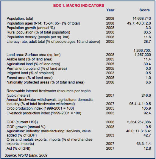 Niger’s 2003 Rural Development Strategy and 2006 Action Plan created a joint plan to promote improved use and production in the agricultural, livestock, forest and fisheries sectors. The policies seek to support the livestock and agricultural sectors by strengthening marketing channels, supporting infrastructure such as irrigation, strengthening management of natural resources, and fighting desertification (World Bank 2008b).