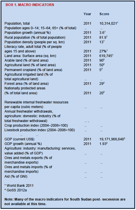 The Republic of South Sudan is the world’s newest country, covering an approximate area of 619,000 square kilometers, estimated to be one third of the total land area of Sudan. The country became independent on July 9, 2011 after two civil wars with Sudan. The wars, which spanned 50 years, have delayed development of basic infrastructure, human services such as education and health, agricultural investment and agricultural extension. Violent conflict between South Sudan and its northern neighbor over resources and revenues, as well as over cultural and religious differences, formally ended with the signing of the Comprehensive Peace Agreement (CPA) in 2005. The CPA established the Government of National Unity (GNU) and the Government of South Sudan (GoSS) and supported wealth and power-sharing arrangements during a six-year interim period for peace building.