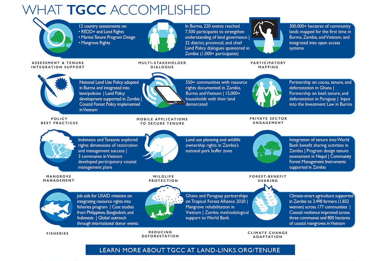 The Tenure and Global Climate Change (TGCC) program assisted USAID’s Land and Urban Office to identify and test models to strengthen resource tenure governance and property rights as they relate to sustainable economic growth.