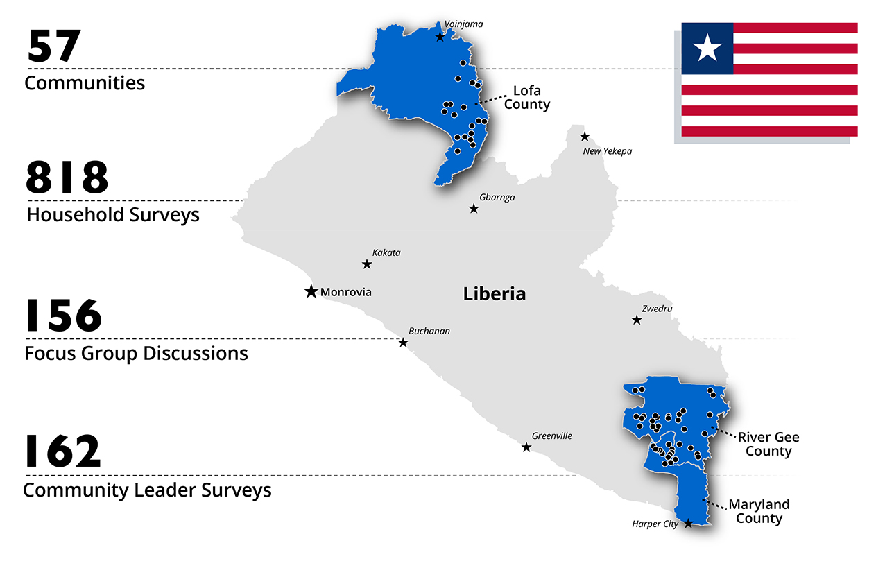 The CLPP midline evaluation used three primary sources of baseline and midline data from 57 communities including household surveys, community leader surveys and focus group discussions. As shown below, the three counties included in the study are Lofa, River Gee and Maryland counties. Baseline data collection took place prior to the start of program activities in 2014 and midline data collection occurred in 2017.