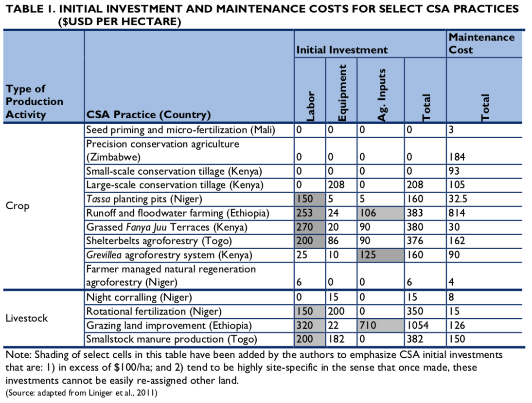 Although the potential benefits associated with CSA—higher yields and farm income, greater resilience, and climate change mitigation—apply broadly, the types of practices and the investments required vary considerably. Table 1 illustrates this by presenting a number of CSA practices under crop, agroforestry, and livestock/pastoral production systems, along with the initial investment costs and recurrent seasonal (maintenance) costs of these practices.