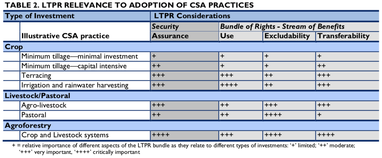 The stylized relationships described above, linking elements of the LTPR ‘bundle’ to the stream of benefits and the importance of having assured, secure rights associated with different types of CSA practices, are summarized in Table 2.