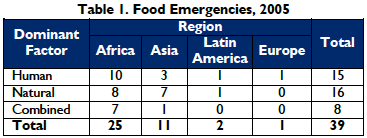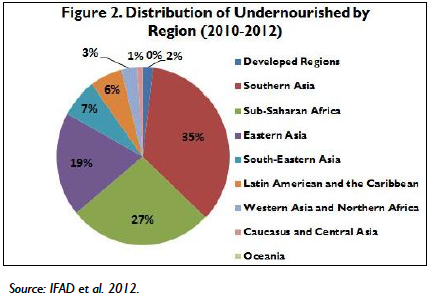 According to The State of Food Insecurity in the World, a joint publication of United Nations agencies supporting food and agriculture programs, statistics for the past two years indicate that almost 870 million people are chronically undernourished (IFAD et al. 2012). As Table 1 and Figure 2 illustrate, the distribution of malnutrition is highly uneven–close to 98 percent of the undernourished reside in developing countries–and food crises are often initiated or magnified by humans, who can limit the availability of food directly through conflicts, or indirectly through actions that exacerbate the effect of otherwise minor natural hazards (IFAD et al. 2012; FAO 2006).