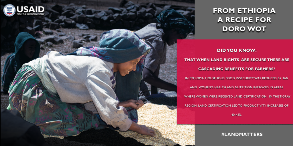 Secure land rights play a vital role in improving food security and nutrition while reducing extreme poverty and hunger. We know that farmers who are confident that their rights to the land they cultivate will be respected in the future, are more likely to invest in improved production practices, such as soil and water conservation or tree planting, that can help boost their yields and ensure their land will remain fertile for years to come. When secure property rights can be traded, whether through sales or leases, the most capable farmers, including women and the poor, are also able to acquire more land to grow their successful farms – and their neighbors can access capital to invest in off-farm enterprises that have knock-on effects and are an important building block to create more resilient rural economies.